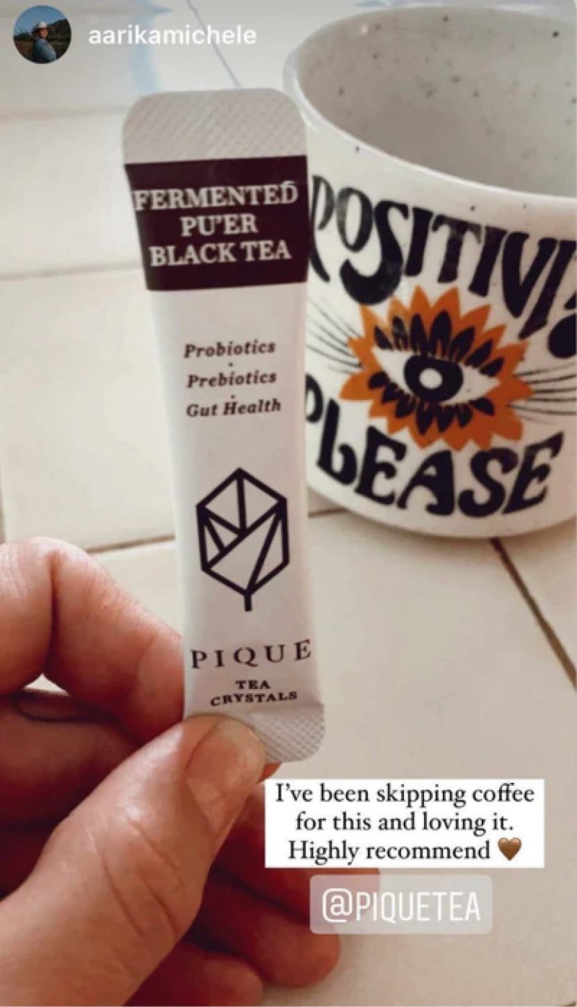 "I use Pique regularly during my travels. It has less caffeine than coffee and gives me sustained energy!”