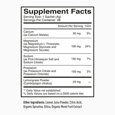 Ingredients: Potassium, Sodium (Pink Himalayan Salt and Sodium Citrate), Magnesium (L-Threonate, Glycinate, and Taurate), Calcium, Lemongrass Powder, Lemon Juice Powder, Citric Acid, Organic Spirulina, Silica, Organic Monk Fruit Extract